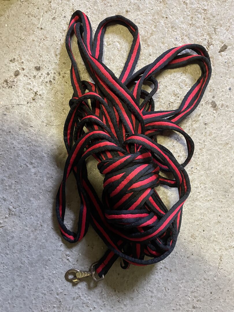 Dubbele longe rood/zwart/messing - Ik heb een longeerlijn te koop :) Ik heb hem ooit cadeau gekregen en nu is hij helaas dubbel. Hij is gesloten, rood/zwart en heeft gouden karabijnhaken. NP: 30€, ik verkoop hem voor 21€ INCLUSIEF 6,99€ verzekerde verzending.