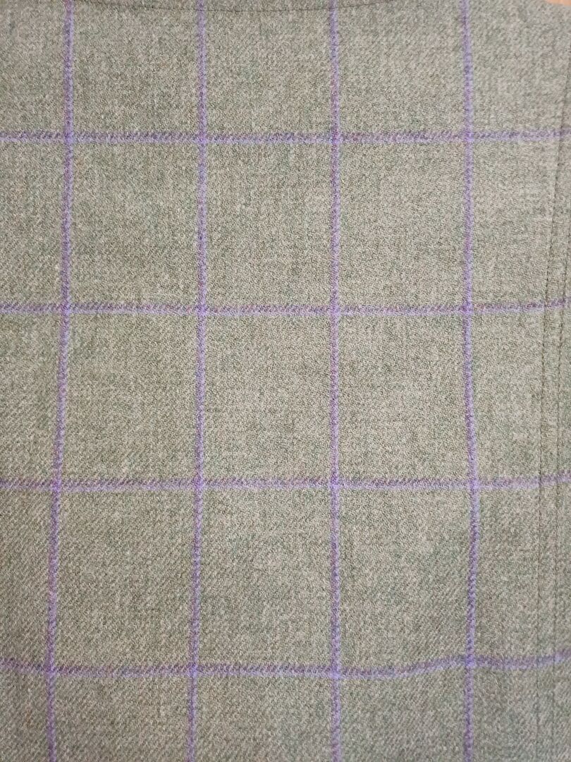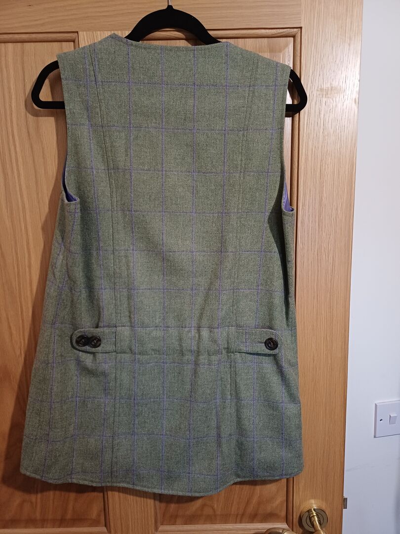 This Really Wild women's waistcoat has never been worn. The tweed is light green with a light purple hatch.