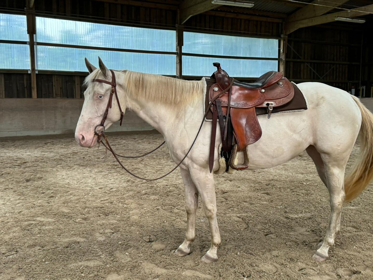 Een geweldige Paint Horse merrie in vrede met zichzelf - Plaats: 29699 Bomlitz Skips Silent Legacy - deze Paint Horse merrie geboren in 2020 maakt indruk met haar kleur - perlino - en haar rustige, absoluut lieve karakter. Ze heeft een stokmaat van 152 cm. Goed ontwikkeld met een correct exterieur en gezond. Silent is meer een rustig type paard. Als iets haar verontrust, denkt ze daar eerst over na. Ze rent niet weg, bokt niet etc. Ze wil het altijd naar haar zin hebben en wil alles goed doen. Ze is erg leuk onder het zadel. Ze is zelfverzekerd in de basisgangen en kent ook trailpalen. Ze is ook heel lief in het terrein. Met verdere training zou ze ook geschikt zijn voor wedstrijden. Ze heeft volledige APHA papieren. Als je op zoek bent naar een prachtig paard in een bijzondere kleur, met een uniek karakter en veel plezier, dan moet je zeker eens naar deze merrie kijken.
