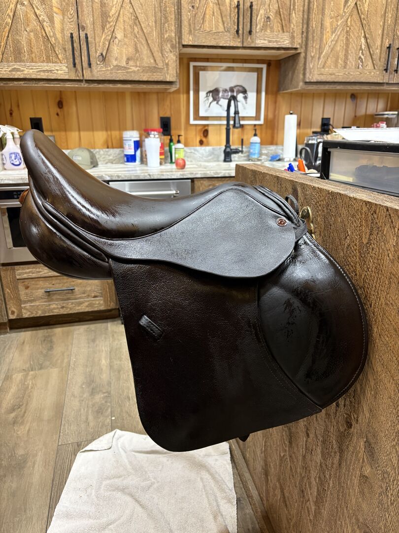 I purchased this custom saddle with buffalo leather in a dark chocolate brown. 17.5" Standard Centennial, twin flap; Rolls on velcro; Brown Remy Hide seat, roll cover, piping, cantle, and front & back facings; Brown Buffalo skirt and flaps; 12.5" flaps. This saddle is in perfect, like new condition but nicely broken in! Paid more than $7k new.