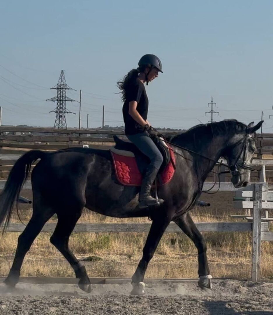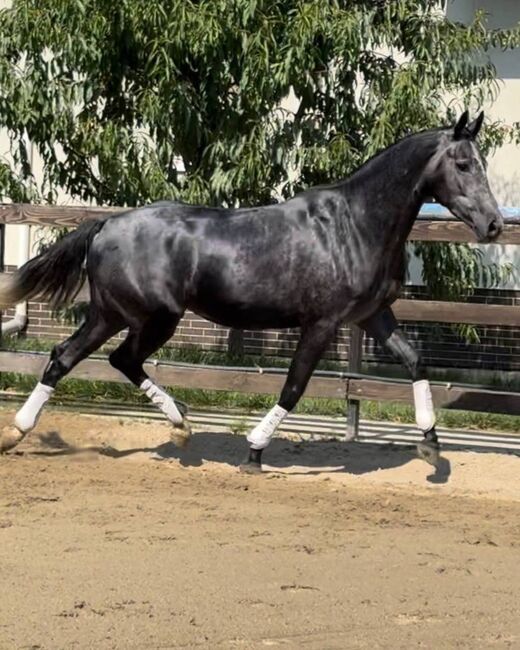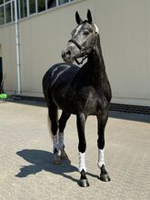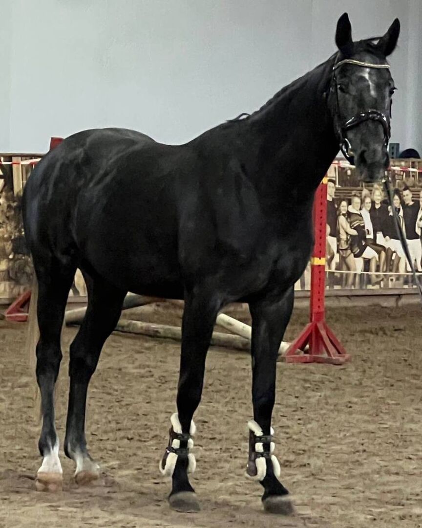 Diese wunderschöne 6-jährige Stute mit einem Stockmaß von ca. 168 cm beeindruckt sofort durch ihren eleganten Rahmen, ihren kraftvollen Körperbau und ihr auffälliges dunkles Fell mit natürlichem Glanz.