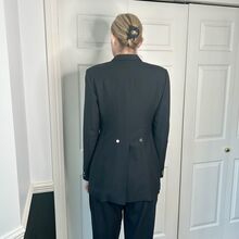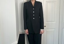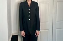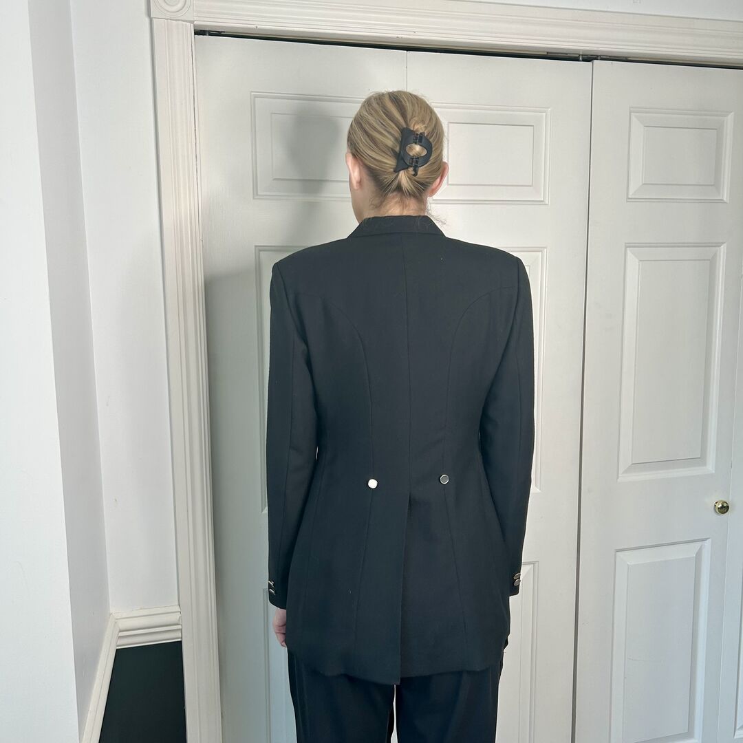 Elite Women’s Dressage Show Jacket Black Size 8 or M/L Used and Excellent Condition Has 4 Silver Button on Front and 2 Silver Buttons on Back Jacket comes in at the waist, has a fitted, hourglass outline