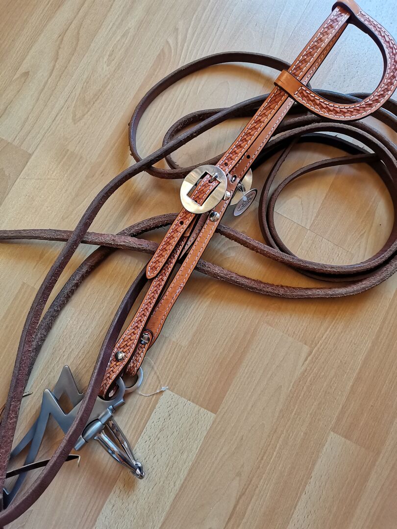 Enkel oorstukje, Lazerbit en Splitreins - Te koop éénoorshoofdstel van Billy Cook met basket punching in lichtgekleurd tuigleer, NIEUW, lazerbit van Pullman, 13 cm breed, middelzware lichtgekleurde tuigsplitteugels van Weaver/Single Ply, 2,40 cm lang, 1,3 cm breed en ca. 0,5 cm dik, zware uiteinden. Lus sluiting. Particuliere verkoop, geen garantie, geen retourzendingen.