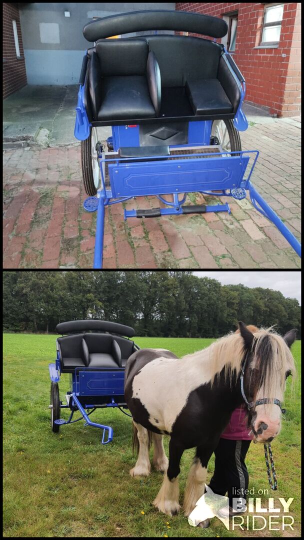 Enkele wagen - Ik verkoop mijn mooie Gig in de kleur blauw, omdat hij alleen maar zit en daar is hij te slecht voor. Hij is nu 1 jaar oud en er is nooit mee gereden. Helaas is er door het heen en weer schuiven wat verf van de schaar gekomen, maar dit heeft geen invloed op de functie. De gig heeft een rem en luchtkussenvering. Het heeft zelfs een opbergvak onder de gig. Verder kan de schraagstoel naar het midden of naar de andere kant. Het stond altijd droog en overdekt. De plannen ervoor zijn door mijzelf genaaid. Het zeil is niet bij de prijs inbegrepen. Ik wilde mijn Tinker optuigen met een hoogte van 1,37 m, maar we besloten dat we liever voor de Marathonwagen gingen.