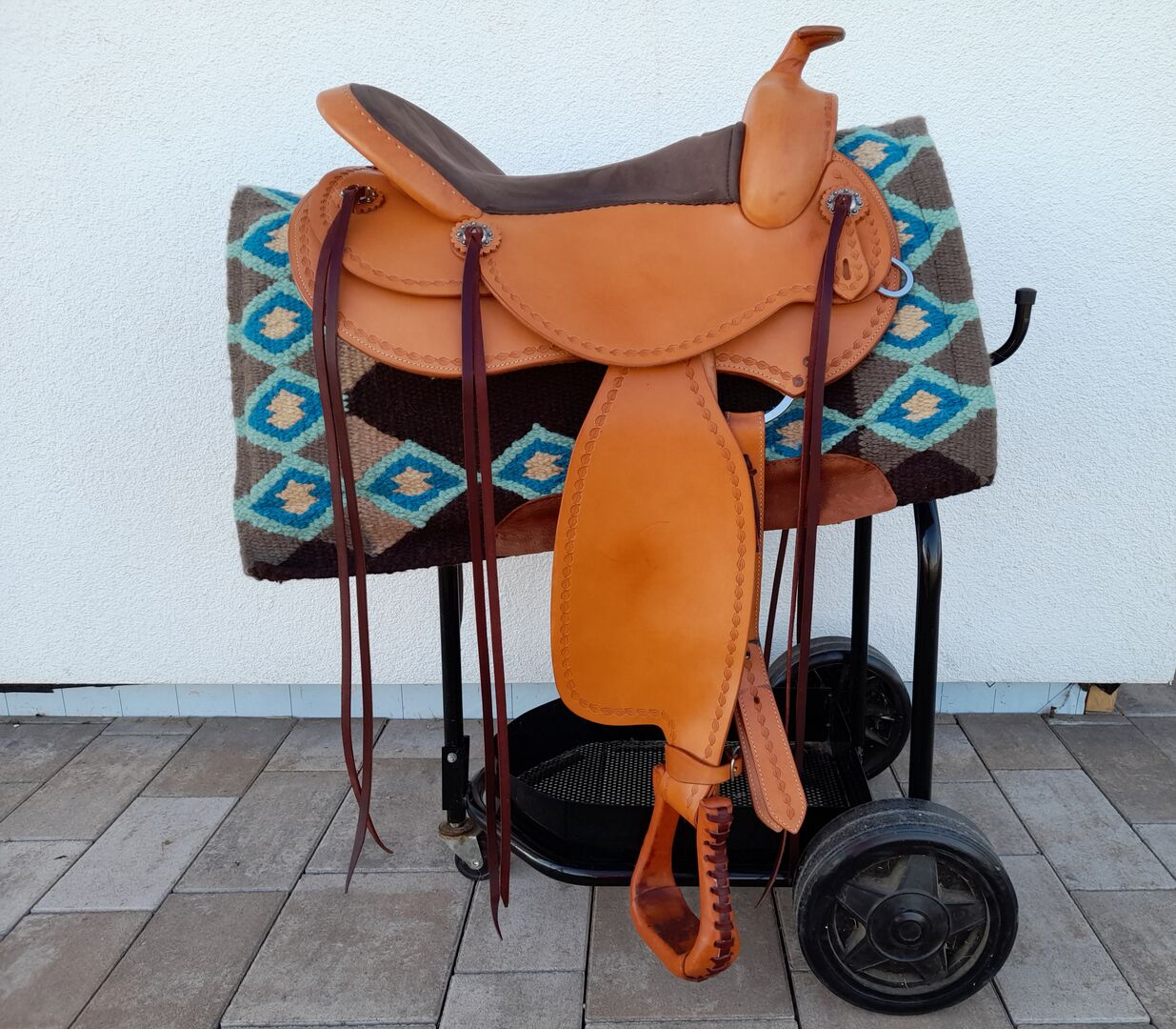 - Kleur: honing geolied, donkerbruin nubuck zitvlak - Zitmaat 15,7" - 72 mm boom - Totale lengte van het zadel: 58 cm - Damesversie (dameszadel) met laag gewicht - "Bladeren" randponsen - 6 snaren van slot conchos - Stootbord met stijgbeugels haaks op het paard - Met leer omvlochten stijgbeugels - kleine gaatjes in de stijgbeugelriemen voor preciezere stijgbeugelverstelling verdubbeld en met stopper - incl. beschermhoes