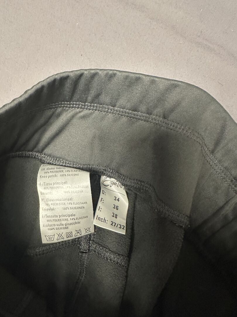 De broek is grijs en heeft maat 34. Hij is gevoerd en de rits van de zak voor de mobiele telefoon zit vast.