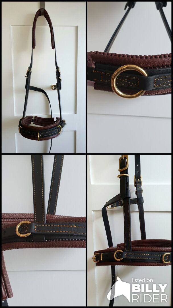 Kleur: Het hoofdstel is zwart en de stiksels zijn goudkleurig Beslag: Messing Vulling (kan op elk moment worden vervangen met klittenband): Donkerbruin Zie ook bijlage