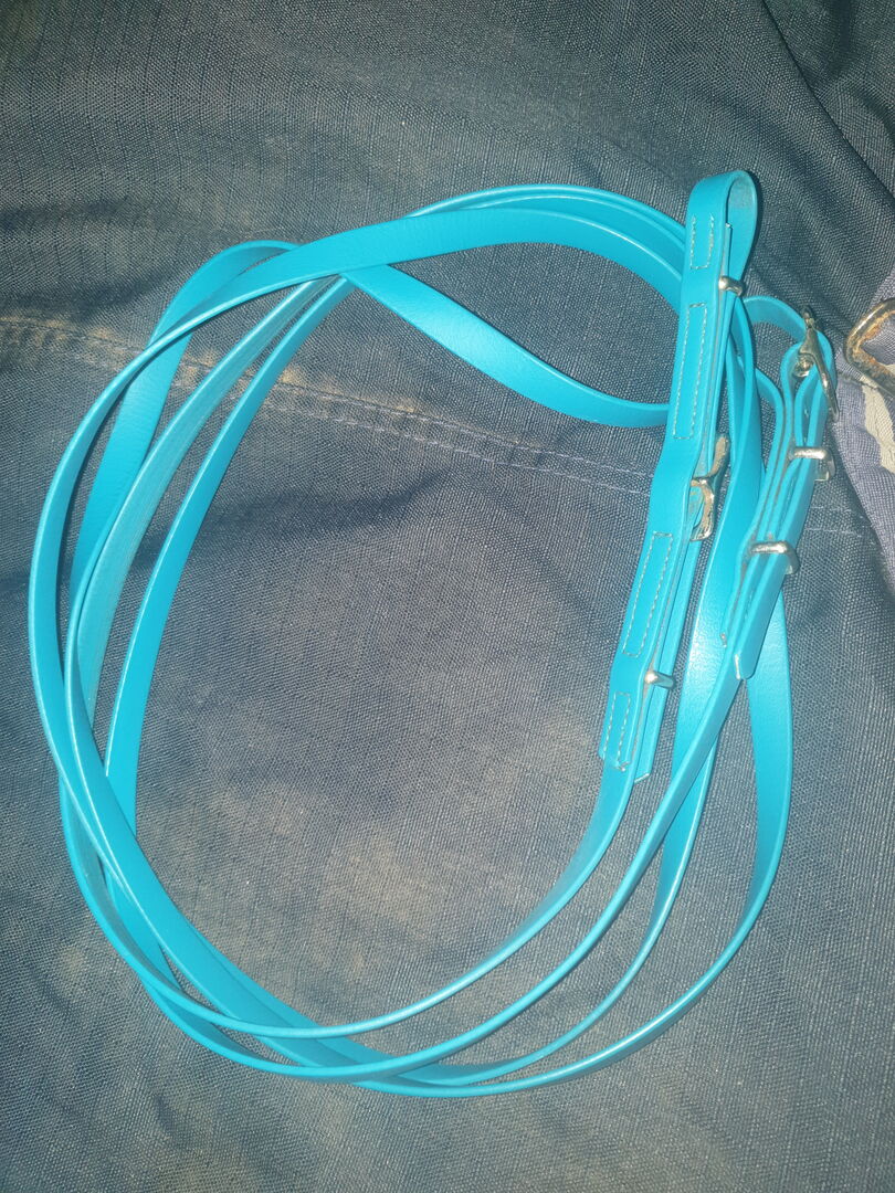Equimero teugels - Er zijn teugels in blauw, petrol en bruin, elk 3 m lang, de bruine hebben een drukknoop in het midden voor bevestiging. Ze kunnen allemaal via een drukknoop of direct worden gebruikt. De prijs is per teugel