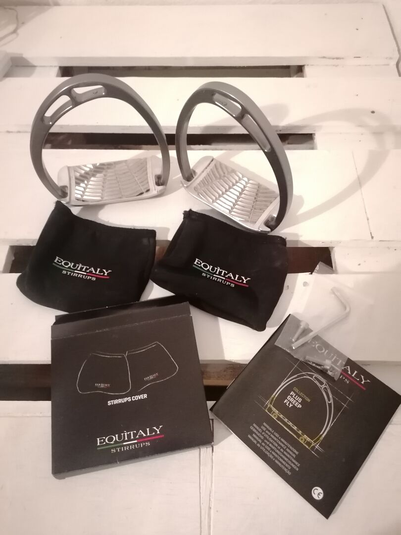 Equitaly stijgbeugels plus - Bied deze stijgbeugels aan. Ze zijn in goede gebruikte staat. Ze worden geleverd met de bijpassende stijgbeugelbeschermers, originele Katon, instructies, bevestigingsset. De stijgbeugels hebben geen gebreken. Anatomische voetplaat, zeer goede voetbeweeglijkheid, stevige grip, zelfs in natte omstandigheden. Perfect voor springen en cross country. Voetplaat: Rugspin. De voetplaten kunnen worden vervangen