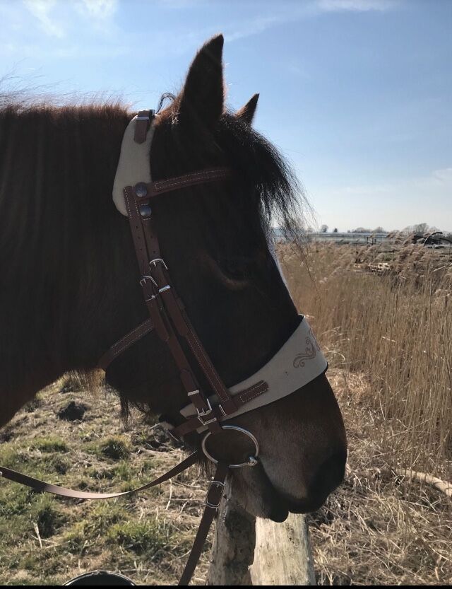 NIEUW - slechts twee keer geprobeerd op het paard. We hebben nu gekozen voor een bitloos hoofdstel, dus ik doe afstand van dit prachtige hoofdstel. De neusriem is (helaas) gepersonaliseerd met een "T", maar dit is op het eerste gezicht niet als zodanig herkenbaar.