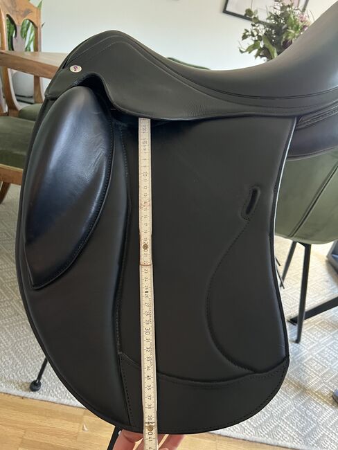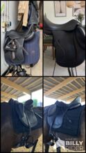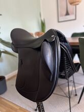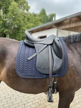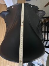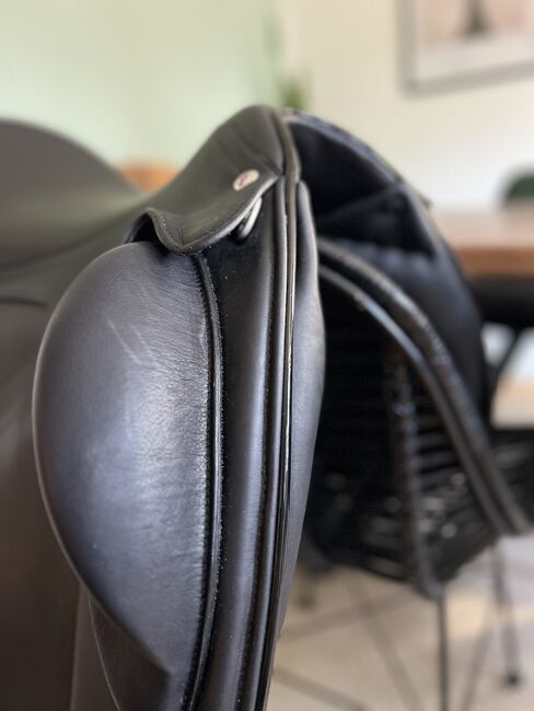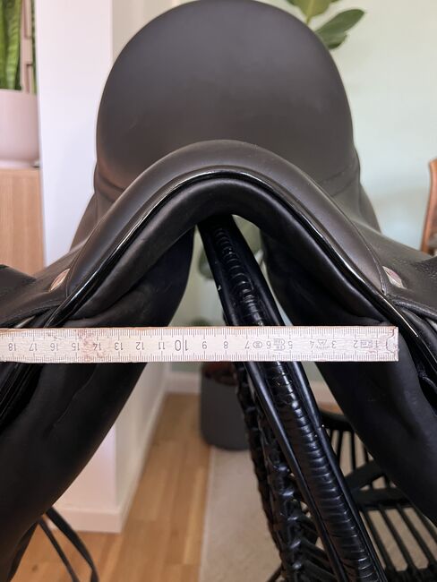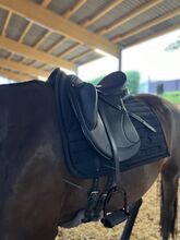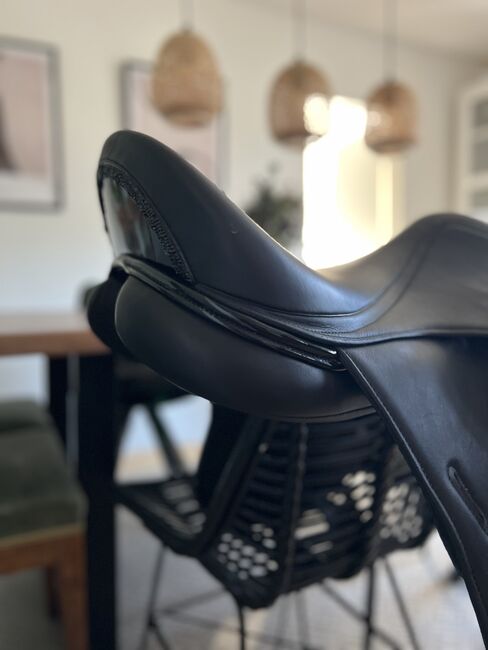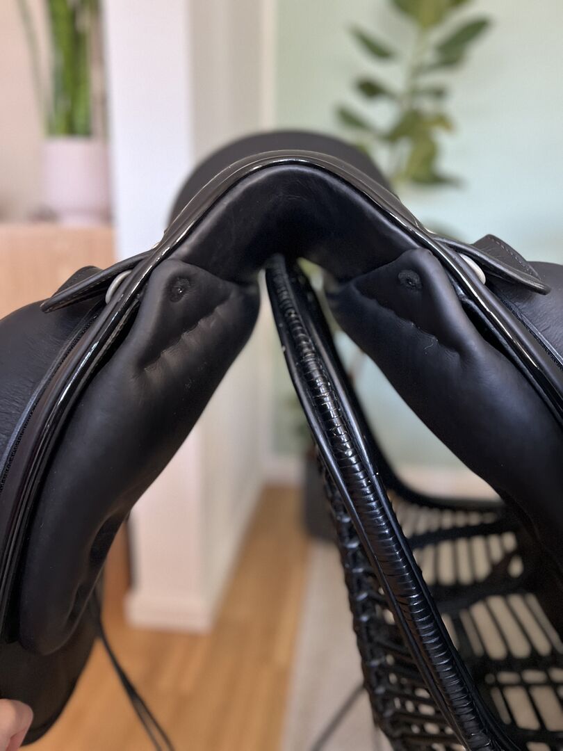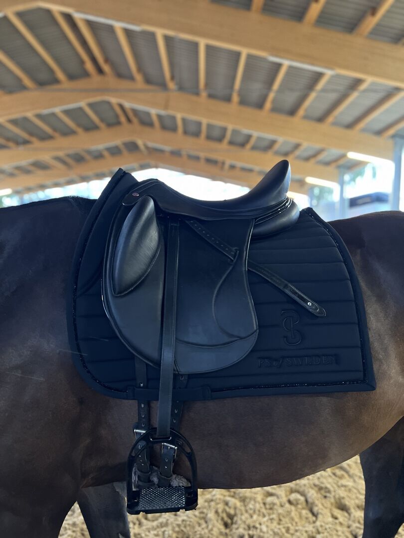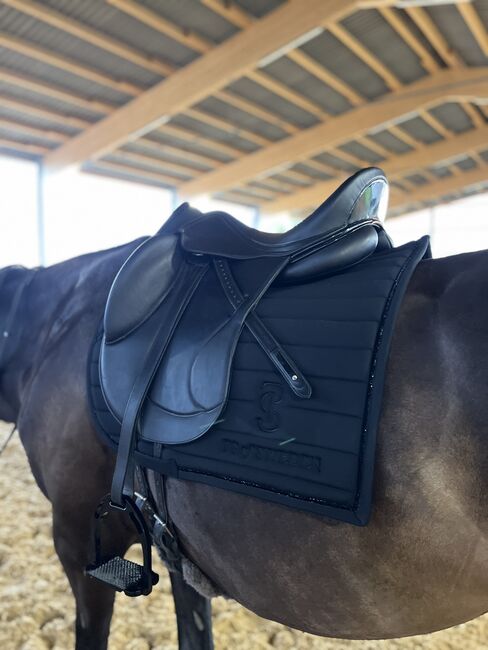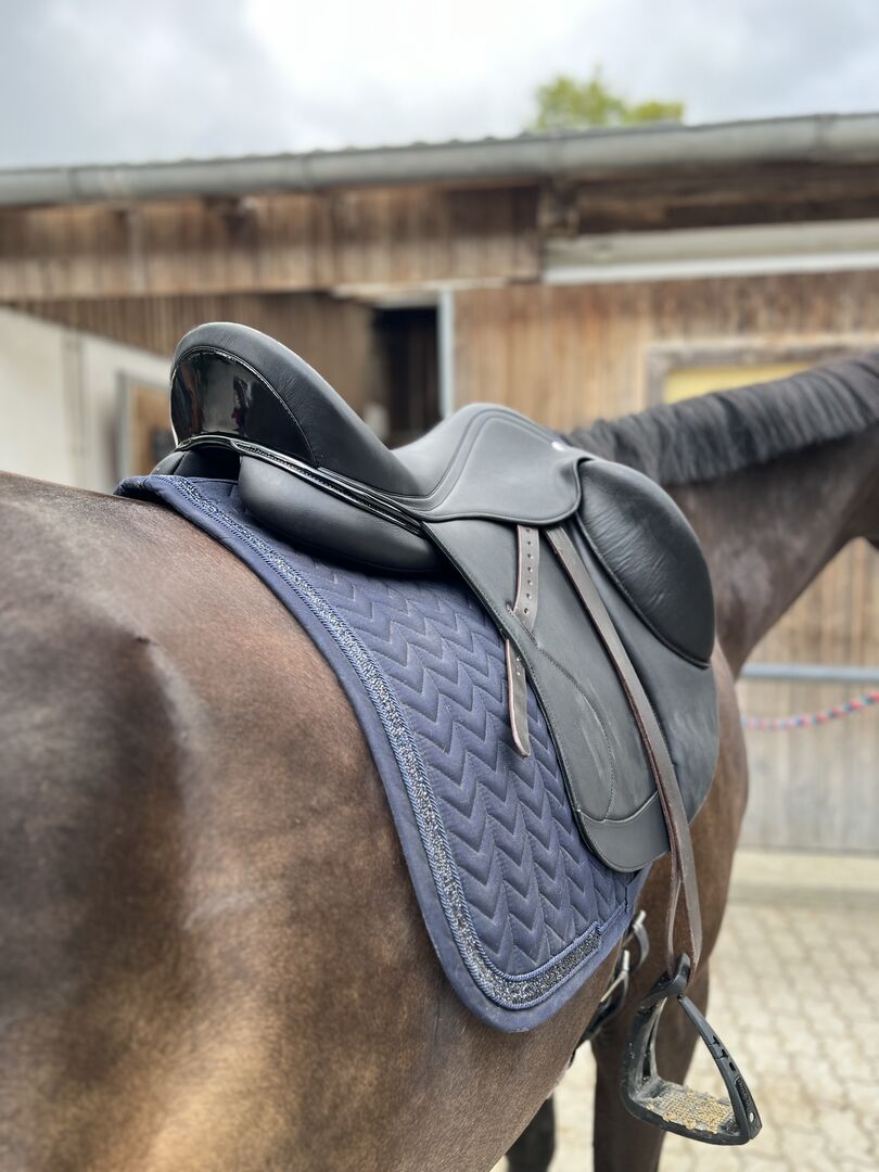 Equiveron Inferno X dressuurzadel mono flap zwart 17,5 inch 17 - Mooi Equiveron mono flap zadel in speciaal ontwerp: het zitvlak is 17,5 inch en halfdiep, de zadelklep is korter en smaller dan de standaardversie, de flap is ook korter (de lange wordt gratis meegeleverd). Het zadel is ook erg kort voor het paard. Lakdetails op de voorste en achterste pommel, evenals op de halve maan, de glitterband is zelfklevend maar kan gemakkelijk worden verwijderd. Zeer gripvast deluxe leer (niet het standaard leer). Veel ruimte bij de schoft aan de zijkanten en aan de bovenkant, breed rugkanaal. De positie van de singelstoten kan flexibel worden aangepast (midden of V).