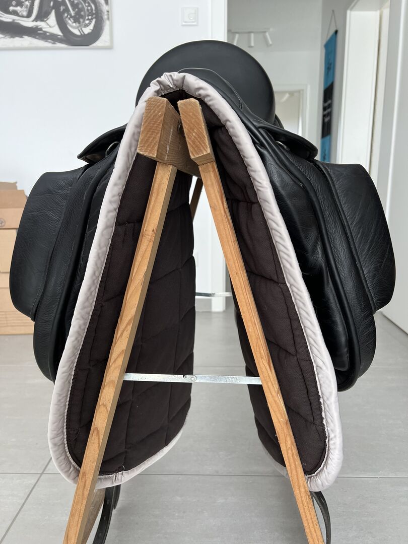 Ergo Saddlefit ESF dressuurzadel 17" mono flap (zoals Hennig ASP) - Het zadel is gebouwd bij Hennig en wordt daar verkocht als ASP. Het heeft een medium tot brede kamer, maar is koud verstelbaar. Het heeft een bijzonder royale schoudervrijheid en vers gevulde panelen. De pommels zijn geschroefd, verstelbare dijbeenrollen, dus de knie is lekker vrij. Daarnaast biedt de bijgevoegde vingerhoed veel steun, vooral voor paarden met sterke bewegingen, maar zonder het been van de ruiter te beïnvloeden. De zitting is super comfortabel en heeft een uitsparing in het gebied van het schaambeen, die is opgevuld met schuim. Het zadel is een monoblate zadel, wat het contact tussen paard en ruiter optimaliseert.