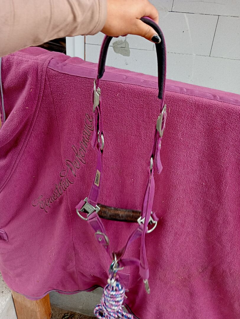 Eskadron halster (roze, paars, blauw) met koord - Het halster is gebruikt en ongewassen. Ik heb een provisorische reparatie aan het touw gemaakt, dus het is alleen voor lieve paarden en wordt gratis geleverd.