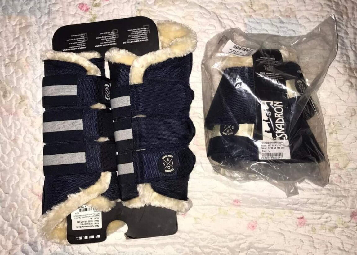 Eskadron imitatiebont navy slobkousen XL jumping bells L nieuw - De klokken kosten 29€ De beenkappen 35€ De belangrijkste in het kort: - Inzameling in Hasbergen - Verzending mogelijk (4,99€ verzekerd) - Geen ruil - De prijs staat vast