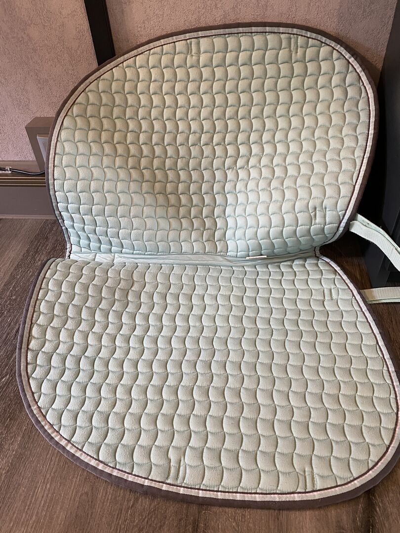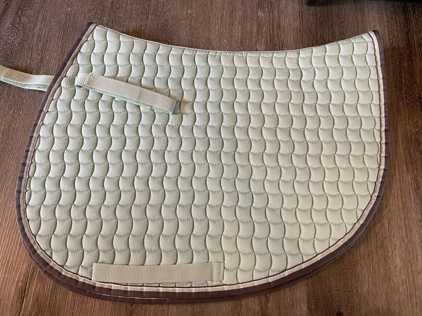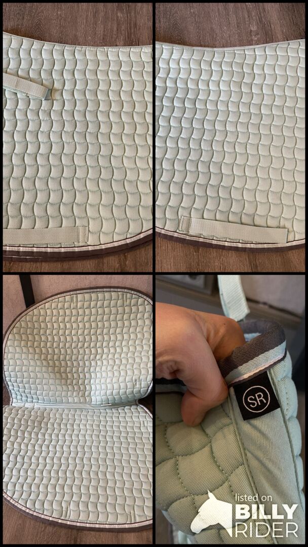 Eskadron Katoen jade SR - Ik verkoop een nieuw zadeldek van Eskadron. Het is een Katoen in de kleur Jade in de maat Warmbljt SR (springen). De kleur is een beetje moeilijk te fotograferen, maar op de laatste foto is hij vrij kleurvast. Het zadeldek is slechts één keer kort onder het zadel geweest, om er vervolgens achter te komen dat het niet onder mijn zadel past, omdat het bij de flap vrij lang is afgesneden. Daarom kan het er weer af.