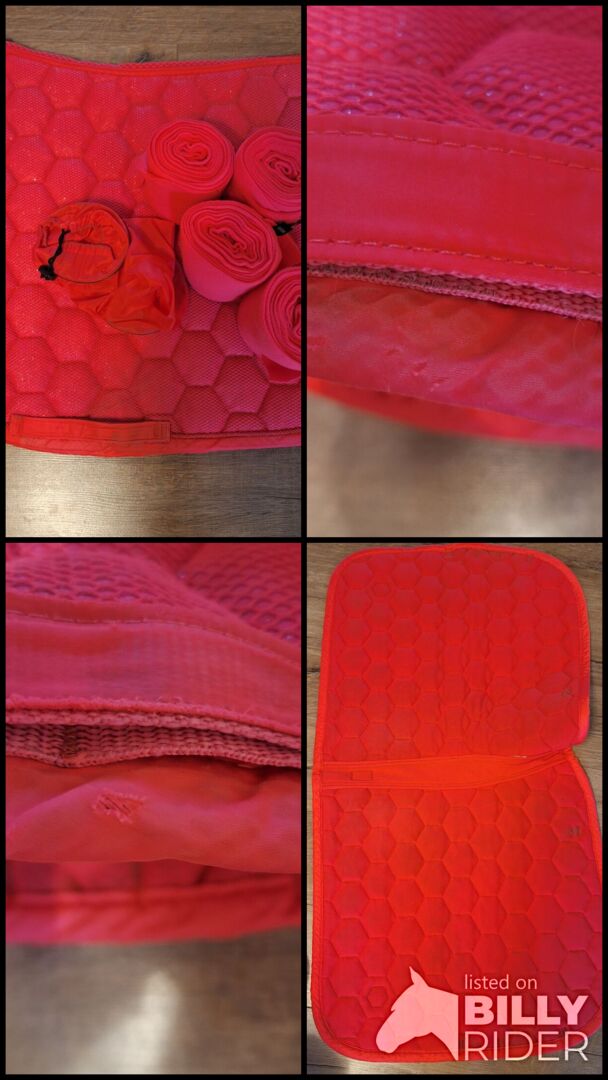 Eskadron Reflexx Roze Dressuurset - Ik verkoop deze gebruikte set bestaande uit een glitter mesh dressuurzadeldek met bandages. Zoals op de foto's te zien is, heeft het zadeldek aan één kant een klein gaatje in de singel en is het aan beide kanten licht verkleurd van het zadel. De bevestigingsriempjes ontbreken ook. Verder in goede staat.