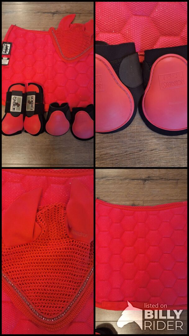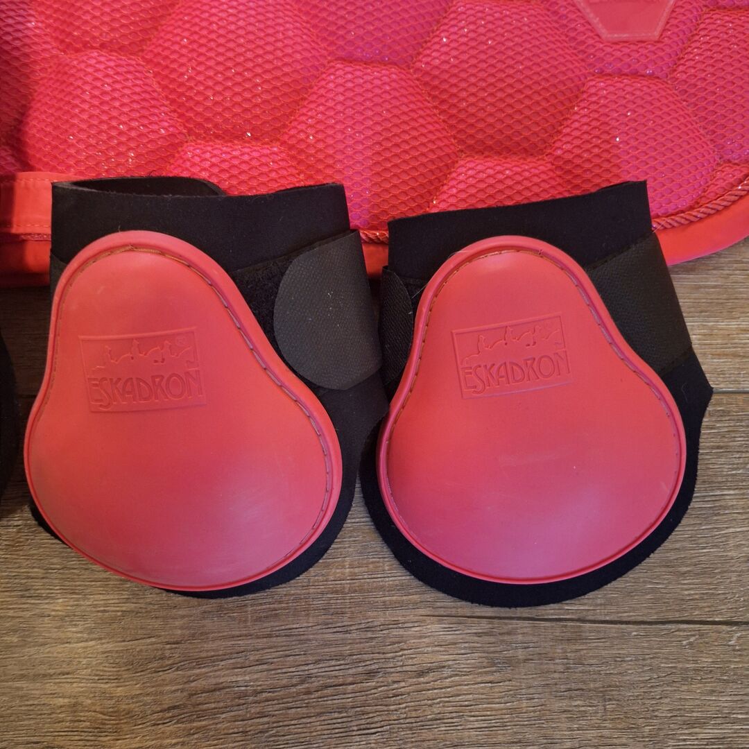 Eskadron Reflexx Roze Set Springen - Te koop deze set bestaande uit een nieuw VS zadeldek met het één keer gebruikte vliegenmutsje en de hoogste 2 keer gebruikte slobkousen met kogelbeschermers. De beenkappen en kogelbeschermers hebben minimale gebruikssporen aan de binnenkant en buitenkant. Voor de rest zijn ze als nieuw.