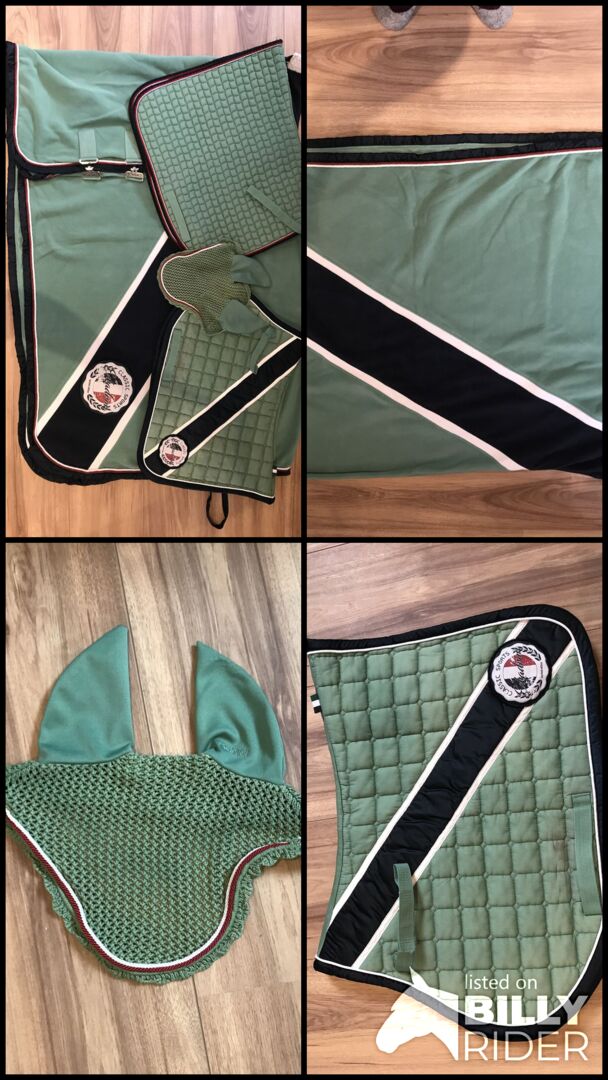 De set bestaat uit een zweetdeken (maat 145), een springzadeldek, een dressuurzadeldek en een bijpassende vliegenkap.