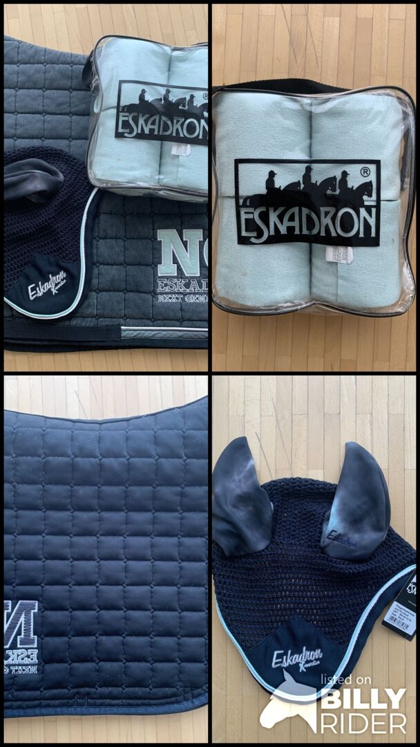 Eskadron Set (zadeldek, bandages, vliegenmuts) - Ik bied een set aan van de Eskadron Next Generation 2016. Het zadeldek en de bandages zijn een paar keer gebruikt en hebben geen tekenen van slijtage. De vliegenmuts is nieuw met prijskaartje. Het verband en de vliegenmuts zijn maat WB.