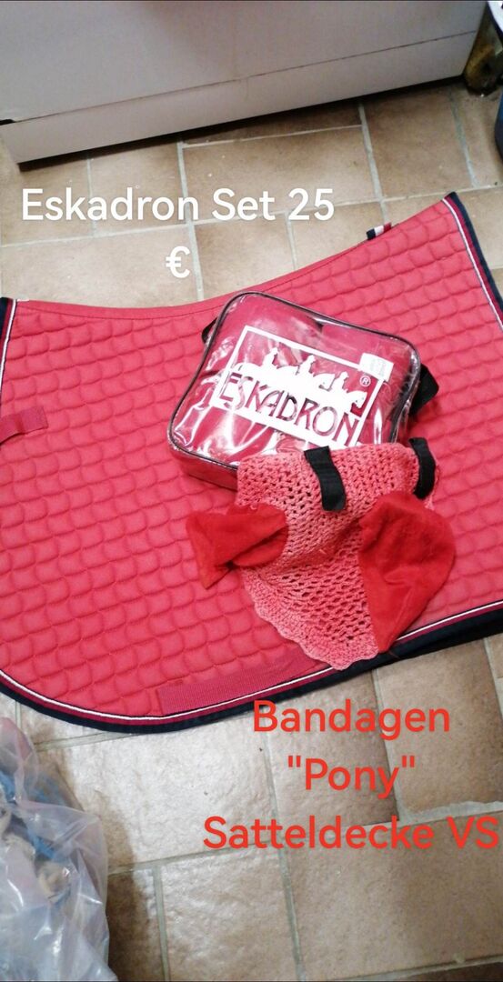 Eskadron set zadeldek katoen VS, ponyverband en vliegenmuts - Verkoop hier mijn zeer weinig gebruikte Eskadron set in pastel rood, zadeldek eventing volledig bandages pony bandages muts niet van Eskadron maat volledig.