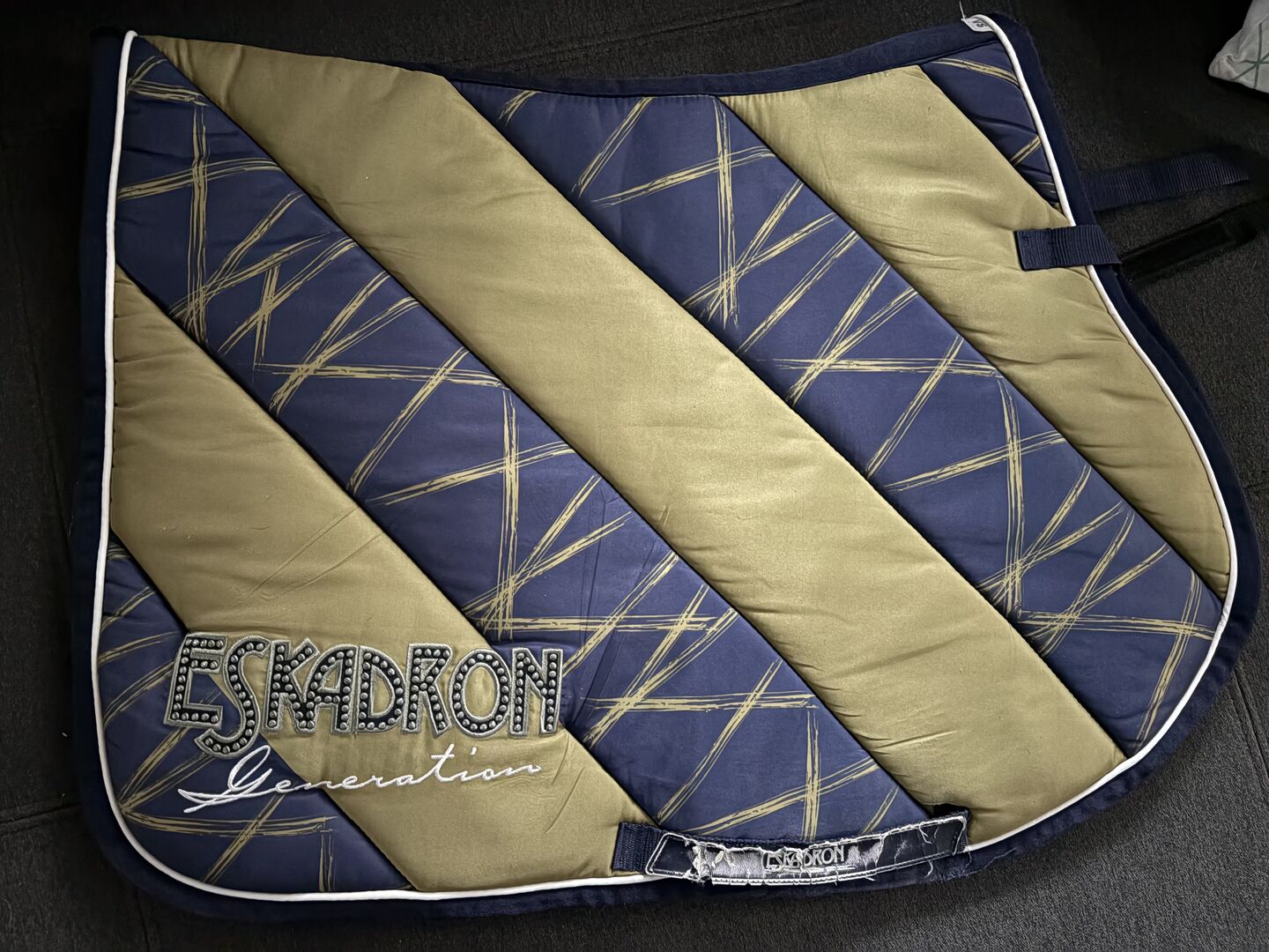 Eskadron Zadeldek - Zadeldek van Eskadron in donkerblauw/kiwi-groen met een prachtig patroon iets dikkere stof maat VS goede staat, alleen de singellussen zijn een beetje versleten zie foto