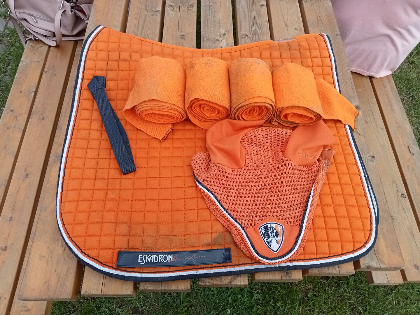 Eskadron zadeldek, bandages en vliegenkap - Verkoop als nieuw Eskadron set . Zadeldekje DL WB, vliegenmuts WB en 4 bandages WB.zonder gebreken maar ongewassen .kleur oranje .25 Euro plus verzendkosten.paypal is mogelijk