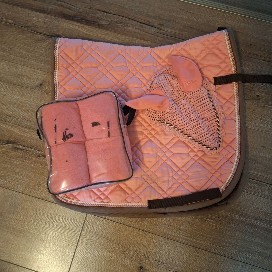 Eskadron zadeldek met bandages en vliegenmuts Roze Roze - Ik verkoop deze gebruikte set. Foto's kloppen niet helemaal met de kleur. Het zadeldek heeft lichte zadelafdrukken.