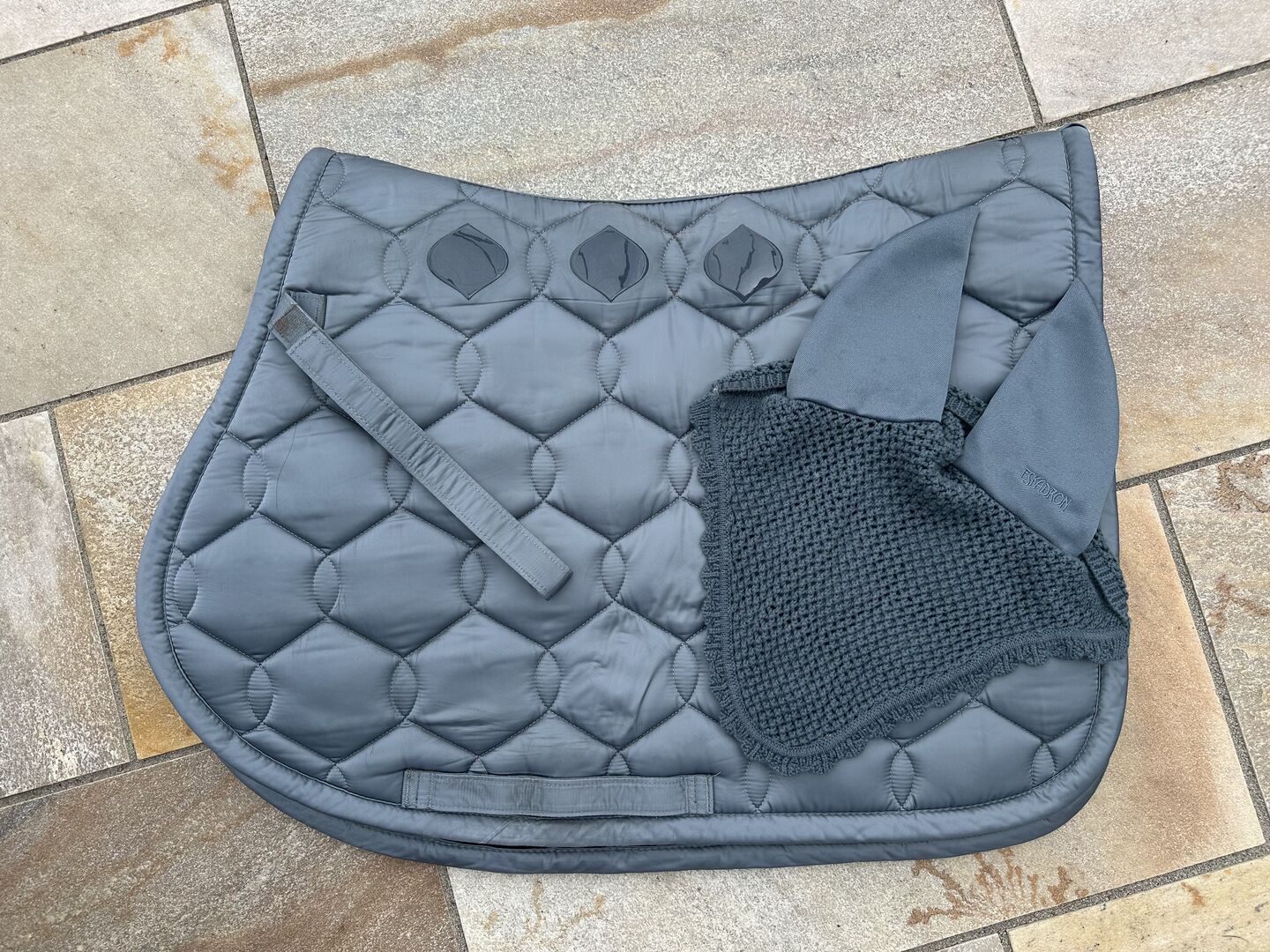 Eskadron zadeldek VS Glossy Wave asblauw grijsblauw warmbloed set - Te koop weinig gebruikt eventing zadeldek "Glossy Wave" van Eskadron in de kleur "ashblue" met bijpassende vliegenoren (ongebruikt) van Eskadron in ashblue. Alle WB.