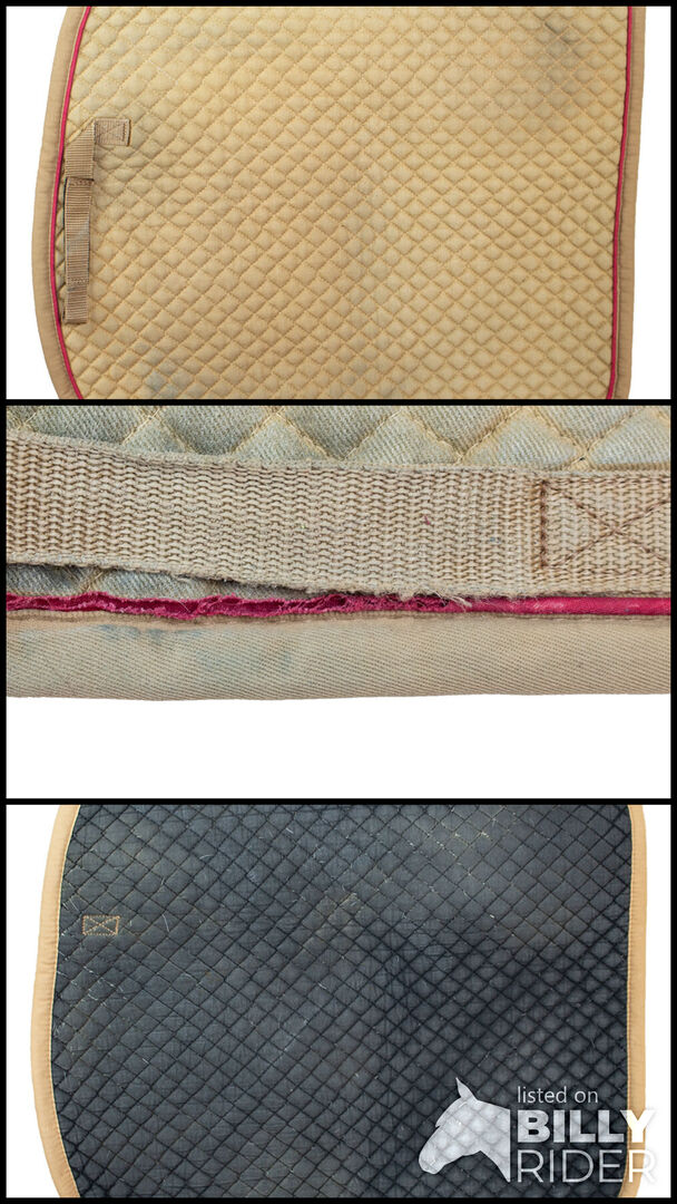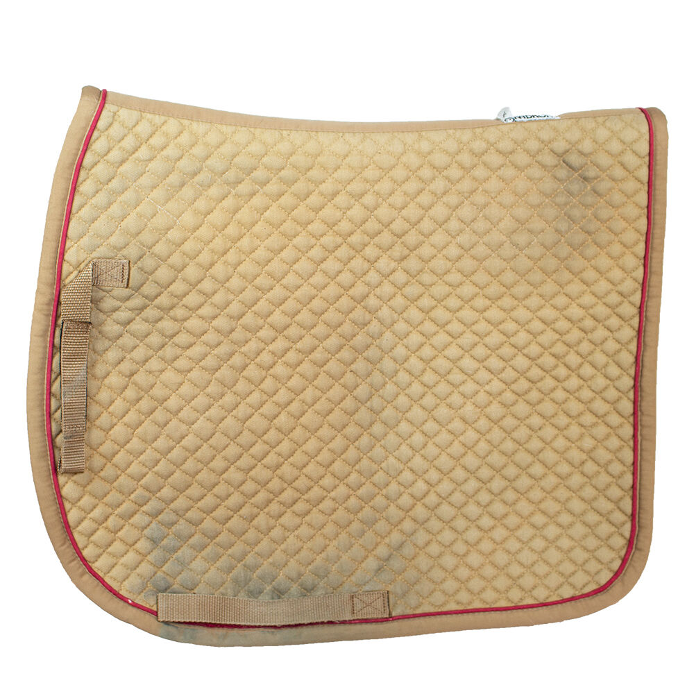 Eskadron Zadeldekje Katoen oker-beige/ rood PD - Een klassiek pony dressuur zadeldek van Eskadron. Het zadeldek vertoont tekenen van slijtage. Het rode koord is gedeeltelijk beschadigd en het zadeldek heeft verkleuringen van het zadel. Het is gemaakt van 100% katoen.