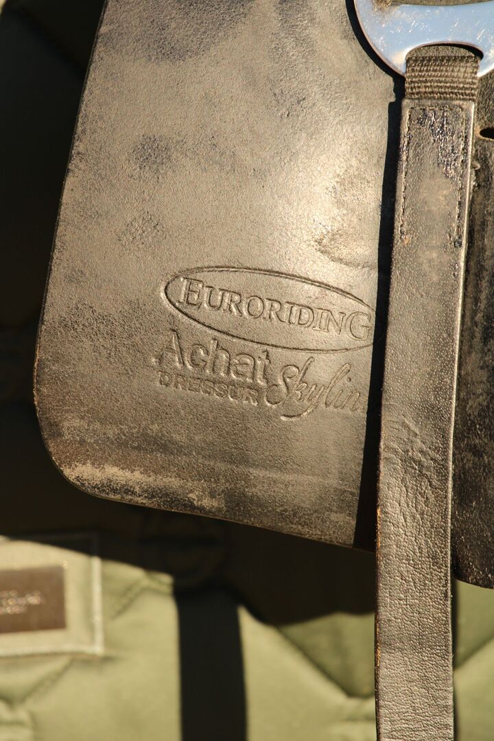 Euroriding Dressuurzadel Achat Skyline 17 inch breed kamer - Ik verkoop mijn Euroriding Achat Skyline met een 17 inch zadel en een 36 cm kamer. Het speciale model van Euroriding met de mooie blauwe stiksels. Het komt met de originele pads met fleece voering.