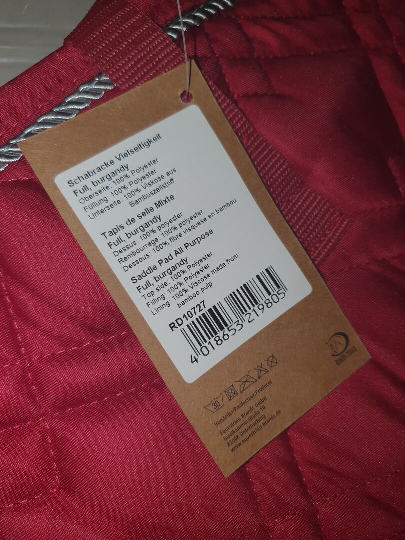 Ik bied een nieuw zadeldek te koop aan. De kleur is bourgondisch. De rand is dezelfde kleur. Het zadeldek is versierd met een discreet lichtgrijs koord en de stof is mooi gewatteerd.