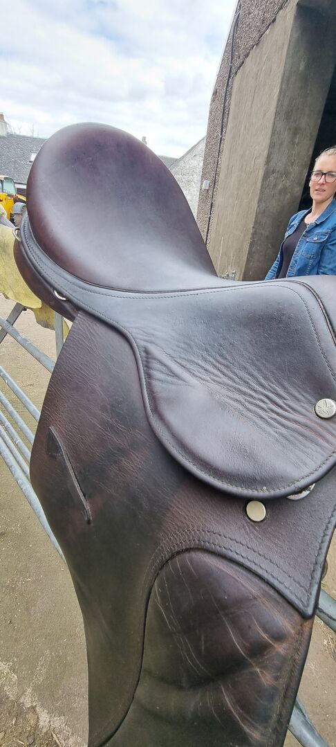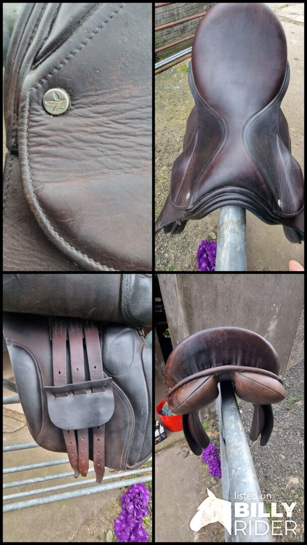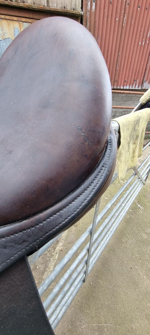 Well used saddle with life left. Came with our pony 2 years ago so unsure of age. Fair condition clean and will definitely do someone a turn. 17.5 inch seat currently narrow but can be adjusted by saddler.