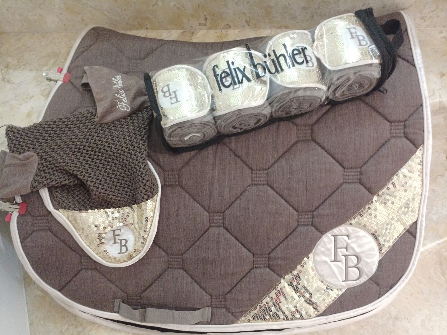 Hier bied ik een nieuw vliegenmutsje aan (heeft nog nooit een stal of paard gezien), vier bandages en een zelden gebruikt zadeldekje (alle pailletten aanwezig). Het past niet onder het huidige zadel.