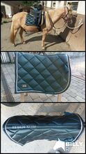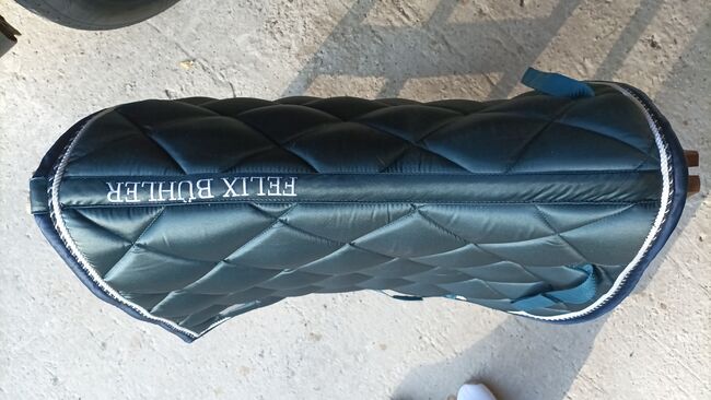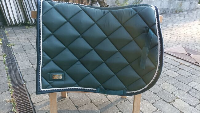 Felix Bühler springzadeldek Swiss Design - In zeer goede staat, vierkant gesneden, chique zadeldek in de kleur Green Tea. Gemaakt van zijdeglanzend bovenmateriaal en decoratieve koorden in bijpassende kleuren. Zadel- en singellussen met praktische KV's. Onderzijde van vochtabsorberend en ademend luchtgaasmateriaal. 100% polyester.