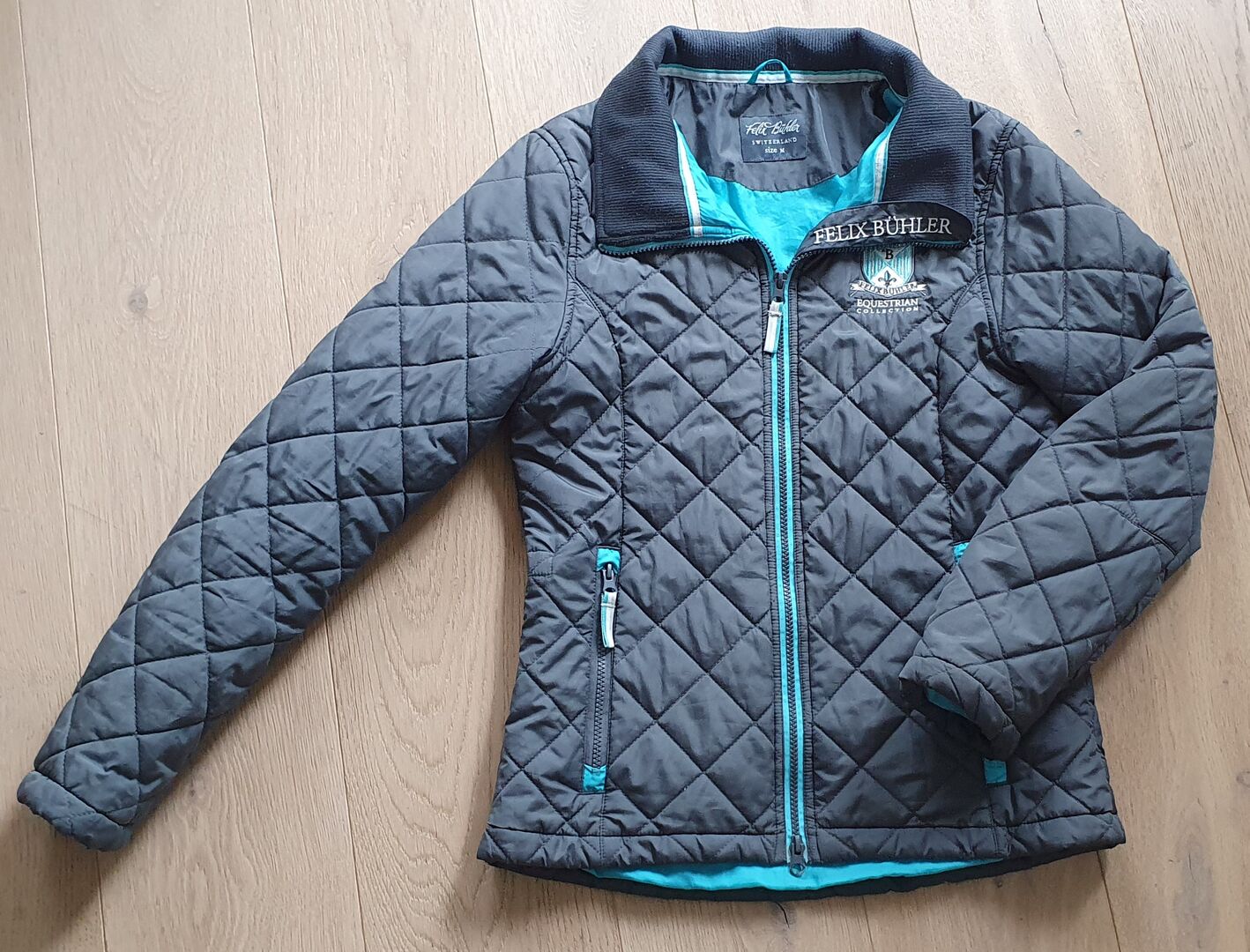 Felix Bühler winter/overgangsjas Gr M - Felix Bühler winter/overgangsjas in maat M, kleur grijs-turquoise. Staat zeer goed, weinig gedragen. 2 zijzakken met rits, 1 binnenzak.