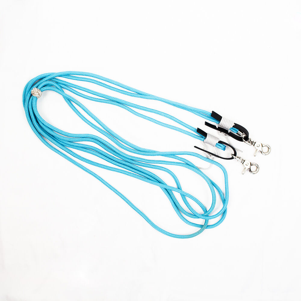 Filogran Stoffen Teugels 6mm Turkoois 2.9m - Deze geweldige teugels van Filogran zijn perfect voor bitloos rijden met een Filogran geknoopt halster. De turkooizen teugels hebben vele mooie details in zilver en zwart. Ze zijn 2,9 m lang, 6 mm dik en extra licht voor een optimale impact en extra fijne hulpmiddelen. We hebben ook het bijpassende Filogran halster en een Filogran touw momenteel in de winkel. Ze zijn in zeer goede staat. To the seller's offerlaunch