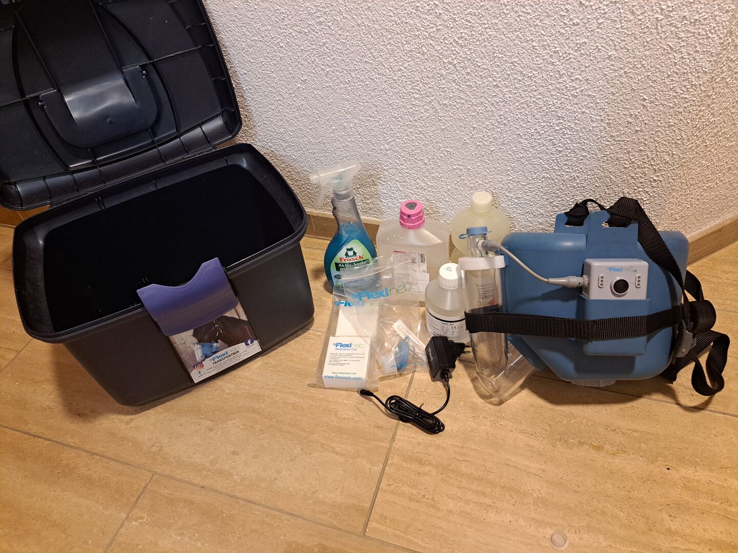FlexiNeb E3 paard / pony inhalator maat M blauw - FelxiNeb inhalator was geweldig voor mijn IJslander. Incl. pekeloplossing 6% en 1 nieuwe pekeloplossing en 1 gestart. Inclusief 2 vernevelaars.