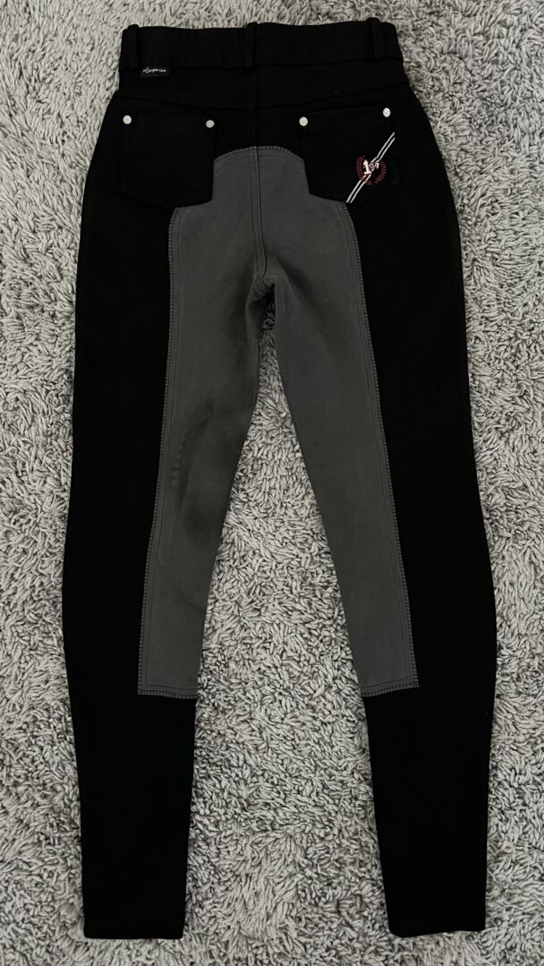 Fourganza kinder tricot rijbroek met imitatieleren bies zwart maat 152/158 - Ik bied aan een kinderrijbroek van Fourganza maat 152/158 in zwart, zo goed als nieuw. De broek is gemaakt van een elastische tricotstof (zoals een legging) met een grijze rand van imitatieleer en twee kleine zakjes onderaan.