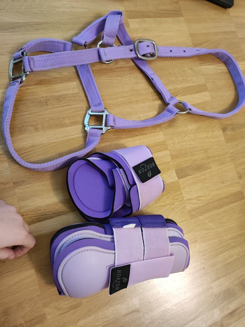 Gaiters met bijpassend halster - Hier verkoop ik een bijpassende set in bijpassende kleuren. Een lichte zwarte lijn aan de binnenkant. Kleine roest op het halster.
