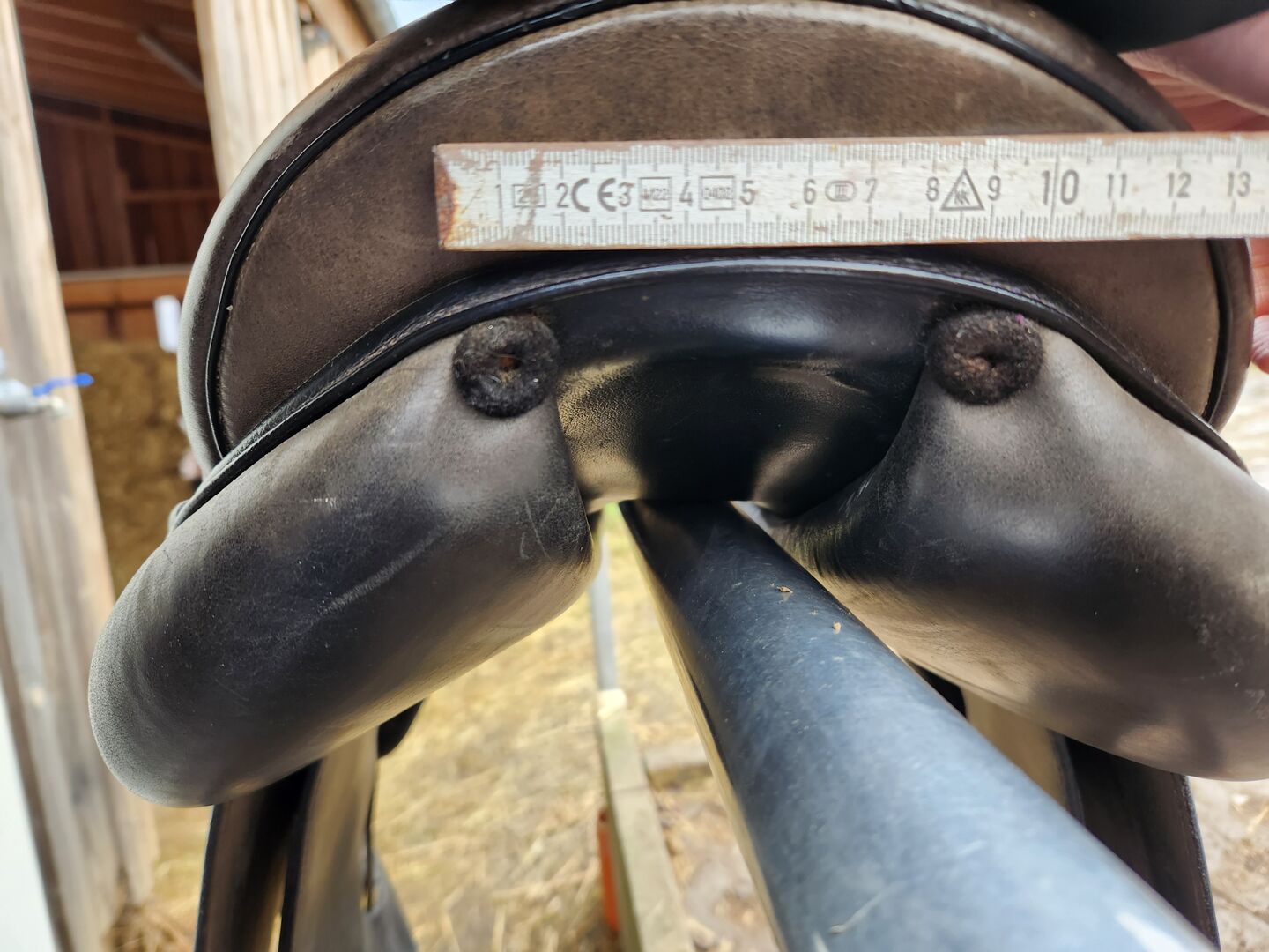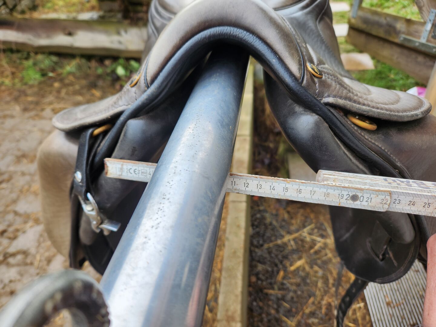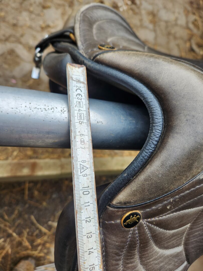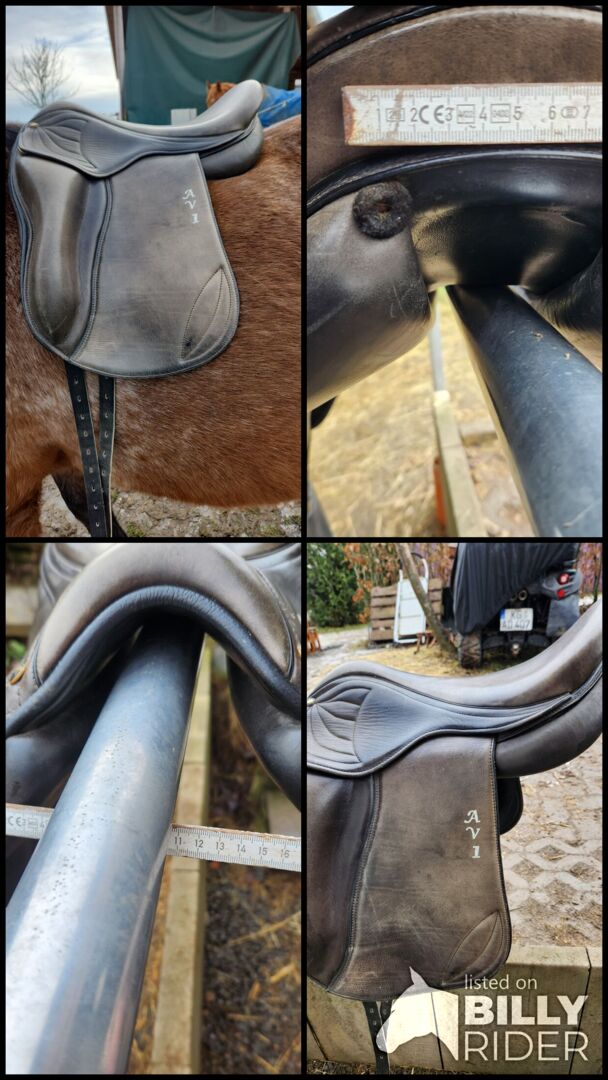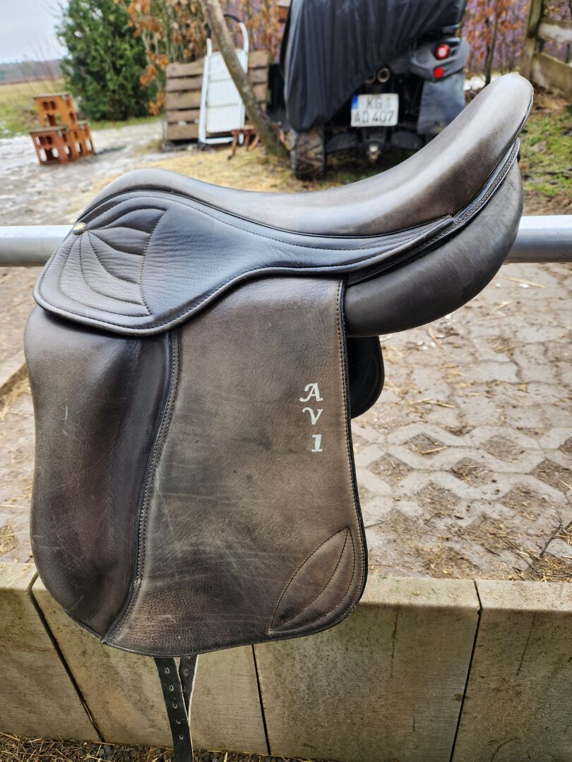 Gangenpaard zadel - Model: AVL 1 (Amanda van Leerwer) Type: gangenpaard / dressuurzadel Zitmaat: ca. 17 - 17.5 inches (meestal standaard bij AVL) Kamerbreedte: Medium kamer (zie foto's met meetlint - ca. 11-12 cm gemeten aan de bovenkant). Speciale kenmerken: * Royale schoudervrijheid. Breed wervelkanaal voor optimaal ontlasten van de wervelkolom. Korte, Franse panelen (ideaal voor paarden met een korte rug). Opvallend borduursel op de zadelklep.