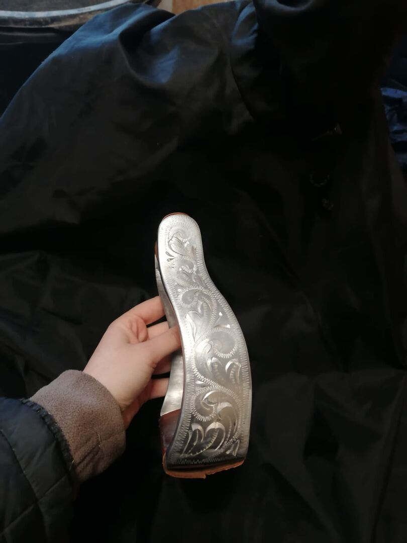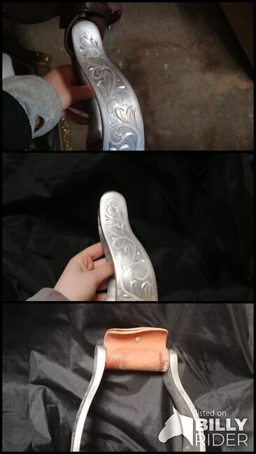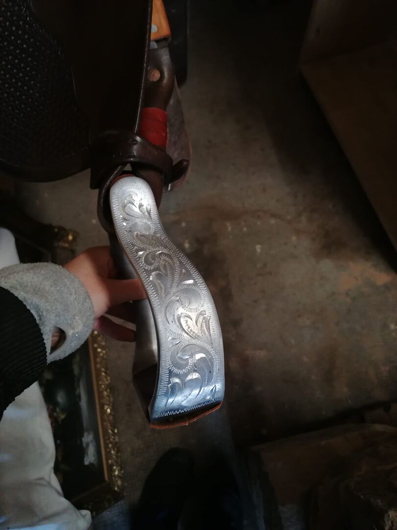 Gegraveerde aluminium western stijgbeugels - Ik verkoop mijn aluminium western stijgbeugels. Ze zijn gegraveerd met een wijnrankpatroon en komen rechtstreeks van de zadelmaker. Ze zijn gebruikt maar nog in zeer goede staat.