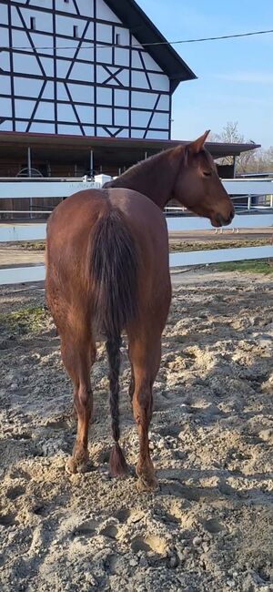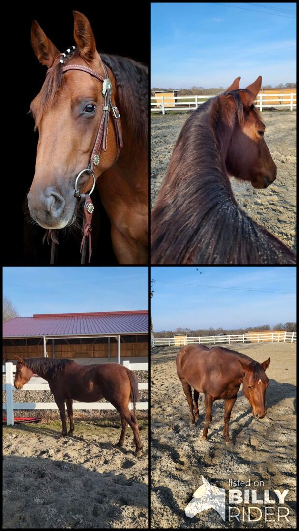 Getalenteerde Quarter Horse jonge merrie voor sport en vrije tijd - Plaats: 72172 Sulz am Neckar Te koop is de mooie Quarter Horse merrie Dun It For June, geboren op 25.03.2022, in de kleur Sorrel met een huidige stokmaat van ca. 146 cm. Ze is correct gebouwd, compact en evenwichtig bespierd en maakt indruk met haar harmonieuze verschijning. De merrie is gezond en 5-panel n/n getest. June heeft een bijzonder lief en prettig karakter. Ze is zeer mensgericht, knuffelig, vertrouwt en wil altijd alles goed doen. Ze is makkelijk in de omgang, vertrouwenwekkend en super braaf, wat haar een prettige partner maakt in de dagelijkse training. Ze is opgegroeid in een kudde, kent zowel open stallen als paddockboxen en is zeer goed gesocialiseerd. Ze is vertrouwd met de dierenarts en hoefsmid en is gevaccineerd en regelmatig ontwormd. Over het algemeen is ze goed gemanierd, goed verzorgd en getraind voor haar leeftijd. Dun It For June heeft goede, comfortabele gangen en is voorzichtig en eerlijk ingereden. Ze is een jaar professioneel gereden, kent alle belangrijke basisprincipes en heeft een zeer goede reining afstamming (Dun It for Whizkey x Doctor In Diamonds). Dit maakt haar bij uitstek geschikt voor reining, ranchrijden en andere disciplines in de westernsport. De merrie is betaald in de EWU jonge paarden programma's en zou dit jaar al getoond kunnen worden in jonge paarden klassen. Of het nu als toekomstig showpaard is of als hoogwaardige vrijetijdspartner - met haar talent, instelling en karakter is ze een echte belofte voor de toekomst.