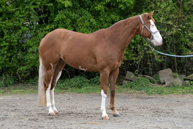 Getalenteerde Quarter Horse merrie met eersteklas reining afstamming - klaar om te showen - Plaats: 51515 Kürten MB Livia Shininggun is een Quarter Horse merrie geboren in 2021 in de kleur Sorrel met een huidige stokmaat van ca. 150 cm. Ze heeft AQHA papieren en een paardenpaspoort en presenteert zich als een mooie, correct gebouwde en zeer type merrie met veel expressie en een harmonieuze uitstraling. Ze is gezond, 6-panel n/n getest en wordt regelmatig gevaccineerd en ontwormd. De merrie is zeer mensgericht, vriendelijk en ongecompliceerd in haar dagelijkse omgang. Livia is braaf bij de dierenarts en hoefsmid, kan zonder problemen beladen worden en heeft geen ondeugendheid. Ze leeft momenteel in een paddock box, brengt de zomer door in de wei en is goed gesocialiseerd. Voor is ze blootsvoets en achter heeft ze glijschoenen. Livia is ongeveer tweeënhalf jaar professioneel getraind en heeft al met succes deelgenomen aan shows. Ze is geregistreerd in het EWU jonge paarden programma en is altijd braaf, controleerbaar en betrouwbaar op shows en in het dagelijks leven. Ook in de wei is ze veilig en rustig. De merrie maakt indruk met haar hoge werkwilligheid, haar uitgesproken "will to please" en haar motivatie onder de ruiter. Dit maakt haar ideaal voor ambitieuze ruiters, vooral op het gebied van reining en ranchrijden, waar ze al als showklaar wordt beschouwd. Haar eersteklas reining afstamming (Shining Spark x Wimpys Smoking Gun kleindochter) maakt haar totaalpakket compleet en maakt haar tot een getalenteerde jonge merrie met veel sportpotentieel en tegelijkertijd een zeer aangenaam karakter.