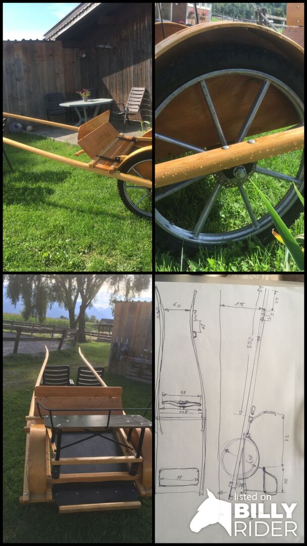 Gig / sulky van essenhout - POSTCODE 83236 Te koop is een klassieke gig van essenhout. Helaas niet meer door mij gebruikt omdat mijn paard (stm 152m) is overleden. Het prachtige essenhout is in perfecte staat en is volledig geschuurd en gelakt met meerdere lagen bootlak, alle slotschroeven/bouten etc. zijn vernieuwd. De wielen zijn zo goed als nieuw (ongebruikt), voorbereid voor schijfremmen, een remsysteem is (nog) niet geïnstalleerd. Een beschermend dekzeil (vrachtwagenzeil) wordt meegeleverd. VB: doe me een realistisch bod van rond de €500 (hij wordt niet weggegeven en een lokale bezorgdienst kan geregeld worden).