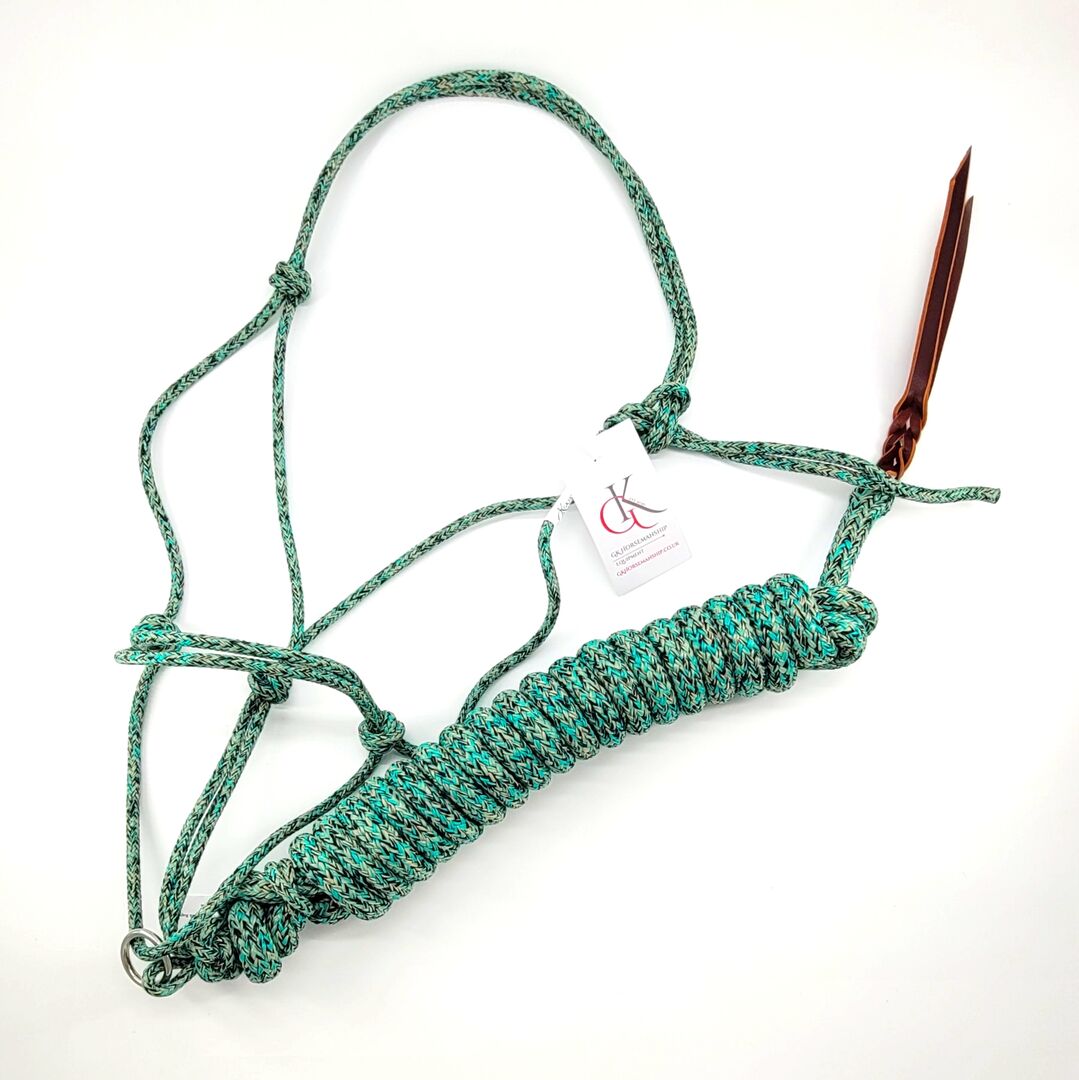 GKH Professioneel Touw Helix Schuifring Halster CAMOUFLAGE met Grondwerk Touw - Camouflage knot halster met grondwerk touw Dunner Professional Touwknoop halster camouflage met schuifring en grondwerk touw in de kleur turquoise.