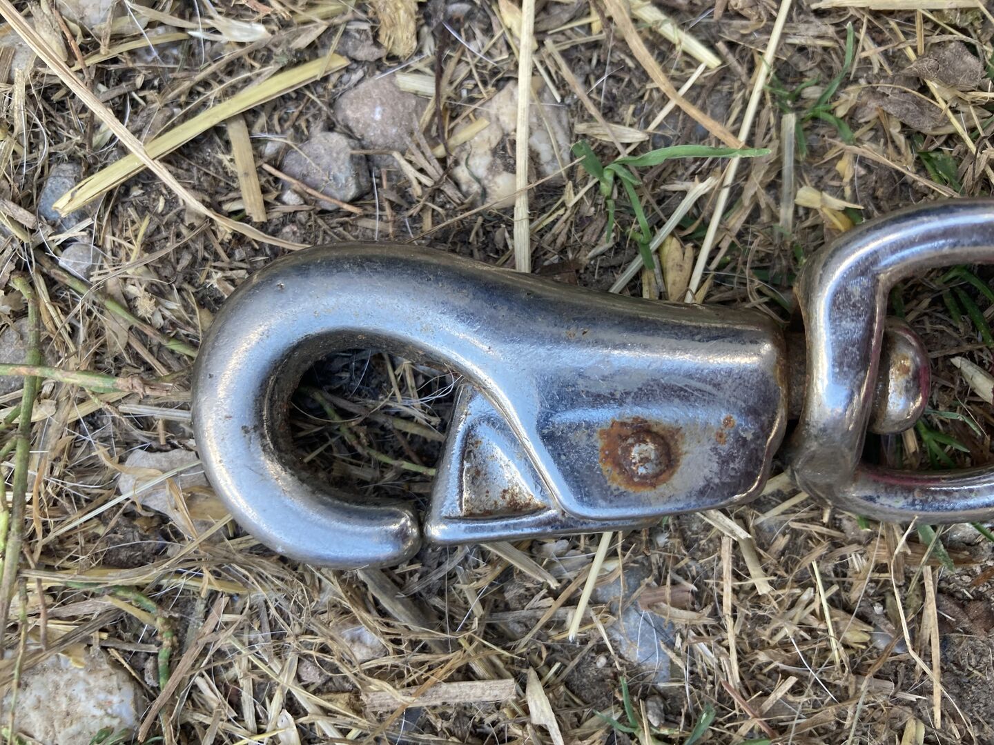 Ich verkaufe ein Weinrot (Bordeaux) farbenes Bodenarbeitsseil in 3 Meter länge mit sicherem Verschluss (s. Foto). 2-3 mal benutzt, daher die Sandreste, leider aber vom rumhängen auch Rostflecken.