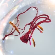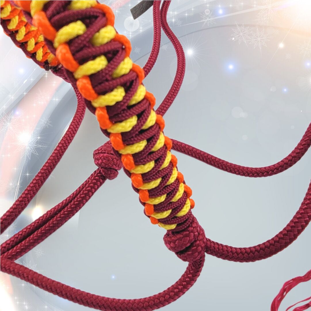 Grote set Bordeaux halsring en knoop halster warmbloed - Opvallende set van Freespirit Horse Art in bordeaux, oranje en oker Set bestaande uit een geknoopt halster met versierd neusstuk en halstertouw. Wordt geleverd met 2 bijpassende veerklemmen. Halster 6 mm dik, halstertouw 12 mm dik