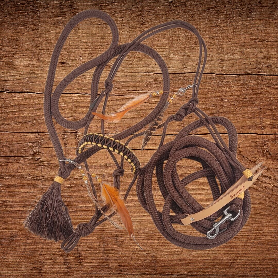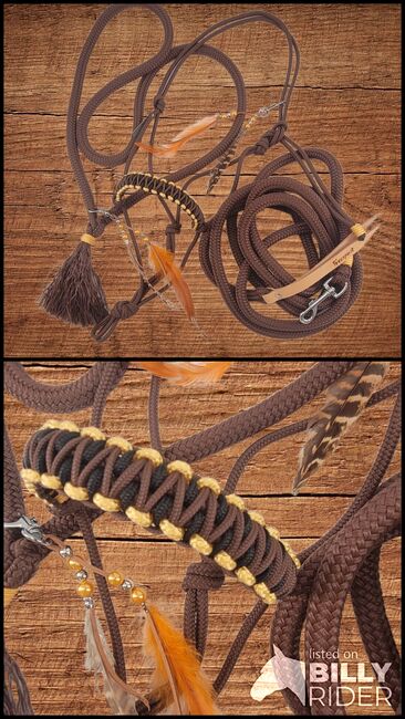 Grote set in bruin PONY knoop halster halsring lang touw - Set Chic in bruin, goud, zwart maat pony Set bestaande uit geknoopt halster in bruin met geknoopte neus in 3 kleuren. In bruin, goud en zwart. Daarnaast een halstertouw in dezelfde kleur met veerklem en een grondwerktouw van 3,7 m. Geknoopt halster 6 mm dik, touw voor grondwerk en halstertouw 12 mm breed.