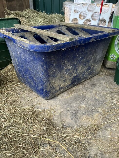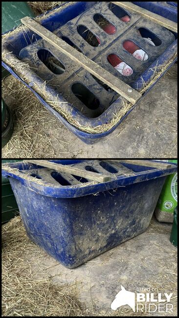 Haas hooibalk 250 l - Ik verkoop een gebruikte 250 liter blauwe Haas hooibalk met voerrem (intrekbaar).