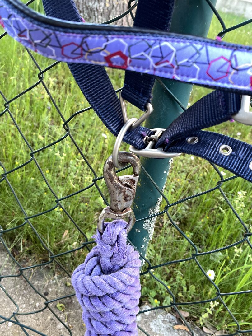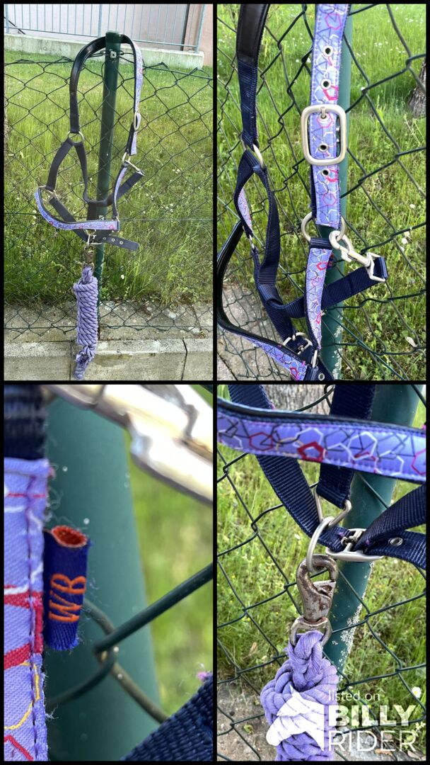 Halster (+/gebreid) paars - Paars halster + touw, halster als nieuw, touw een beetje roestig aan de karabijnhaak, maar werkt nog perfect, WB, lang touw Set: 10€ , halster: 6€ touw: 5€